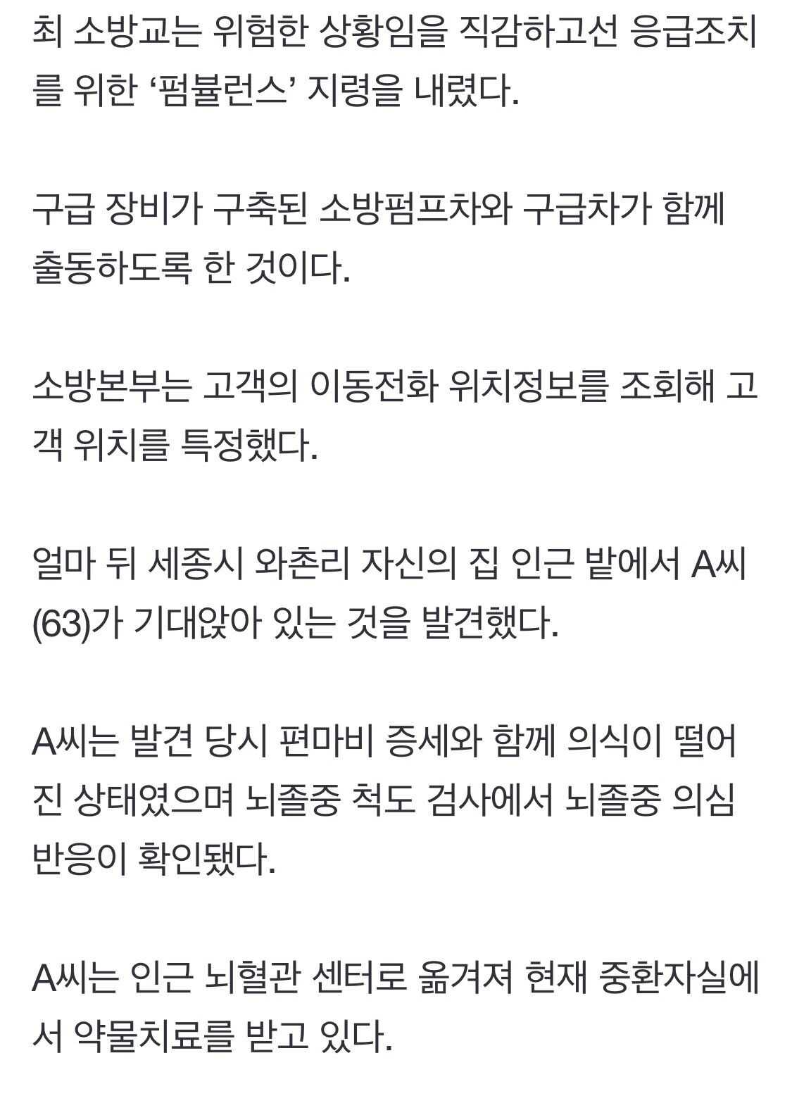 발견 당시 의식이 떨어진 상태였는데 무사히 중환자실로 옮겨 치료받을 수 있게 됨.